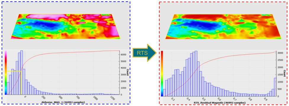 Fig. 1 Example of the RTS being applied to magnetic data dominated by large field values over a mineralized body.¶